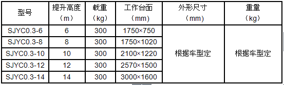 產(chǎn)品規(guī)格:車載式液壓升降平臺根據(jù)升降高度可分為:6、8、10、12、14米升降平臺,設(shè)備載重300公斤至500公斤??蛻艨筛鶕?jù)需求選用解放、東風(fēng)、輕騎、福田、電瓶車等任何車型,設(shè)備直接采用汽車或電瓶的直接動力升降。